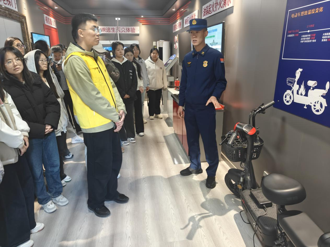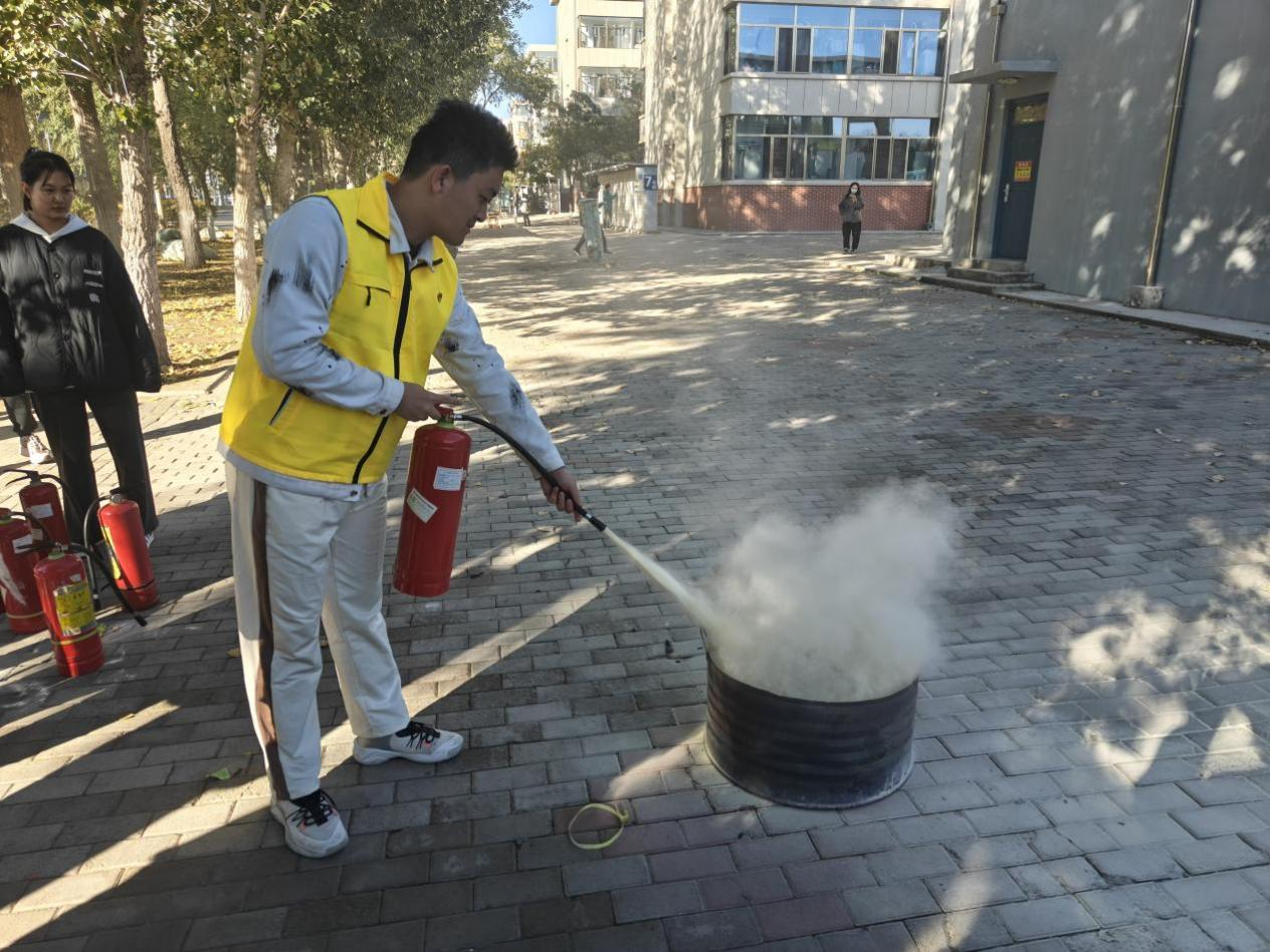 随着警报响起,宿舍楼内模拟烟雾迅速弥漫。参与师生在指挥下用湿毛巾捂住口鼻,弯腰低姿沿预定路线快速、有序撤离至安全区域。随后,消防员现场讲解并演示了灭火器“提、拔、握、压”的操作要领,指导同学们亲身实践。大家还进入消防安全宣传站,通过VR逃生体验、体感换装及各类火灾演示装置,进一步增强了防火自救能力。