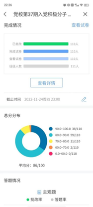 此次培训共安排课程32学时,分为开班仪式、网络理论学习、撰写学习心得、员工授课、专题研讨、结课考试六个环节,其中网络理论学习18学时,员工授课6学时,研讨2学时,自学4学时,结业考试2学时。培训课程紧紧围绕中国共产党的性质、党的十九大党章、党的伟大精神、党的历史等方面内容,线上课程选用共产党员网、学习强国等官方平台内容,公司员工冀虹、梁玉洁、樊易分别讲授了“社会主义核心价值观”、“入党动机与入党条件”“伟大抗疫精神”专题党课。培训后同学们撰写了心得感悟,并于11月22日晚进行了主题分享。结课考试依托“雨课堂”进行,于11月24日完成全部考试,按照培训计划,对所有同学的分数进行了核算,最终110名同学全部合格,达到培训预期目标。