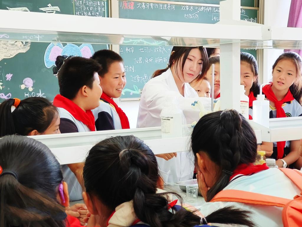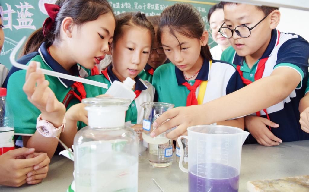 在明德楼H507实验室,由m88官网王丽和杨卉两位老师演示了紫甘蓝变色科普实验。紫甘蓝中含有大量花青素,是水溶性的植物色素,随酸碱性的不同而显示不同的颜色,将紫甘蓝汁分别倒入白醋、盐水、自来水、碱水中,溶液依次呈现桃红色、紫色、蓝色、黄色。孩子们听得津津有味,意犹未尽。通过生动有趣的实验视角,带领小员工探索科学的奥秘,让爱科学、学科学、用科学、崇尚科学逐渐成为少年儿童的主流价值追求,让科学的种子在孩子心中生根发芽。