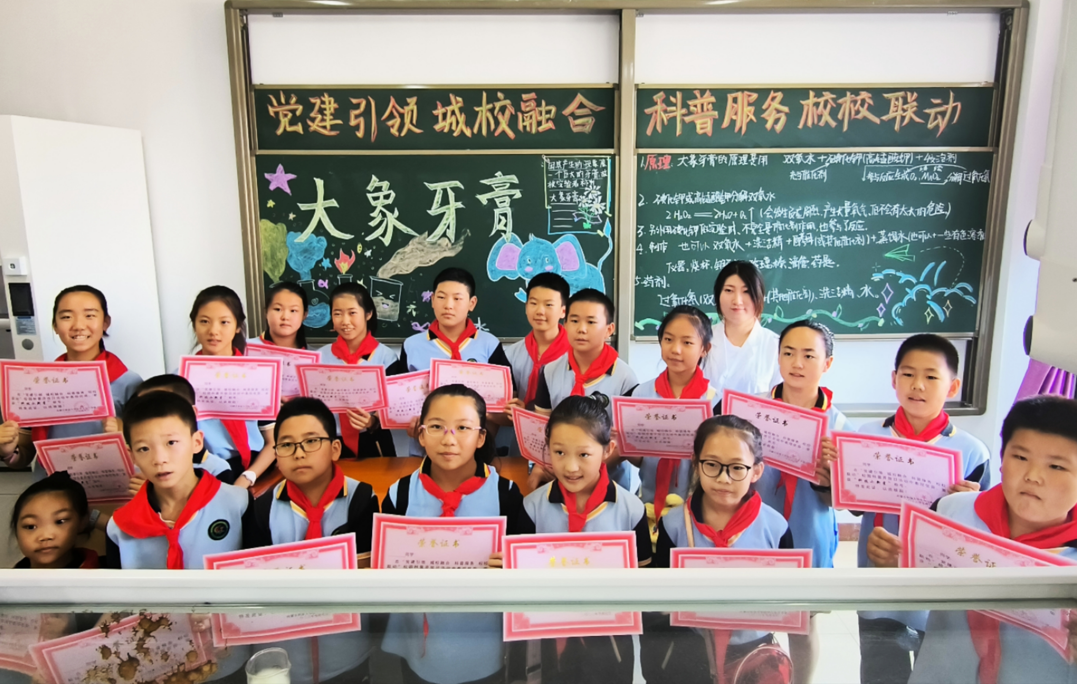 在明德楼H505实验室,由m88官网马庆和陈晓霞两位老师为小员工们演示了有趣刺激的大象牙膏实验。利用碘化钾、二氧化锰催化加速过氧化氢分解的原理,迅速产生大量的泡沫,反应前后体积变化巨大,充分激发了孩子们的好奇心和对化学的热情,有着重要的启蒙意义。