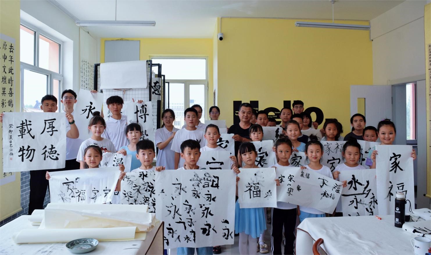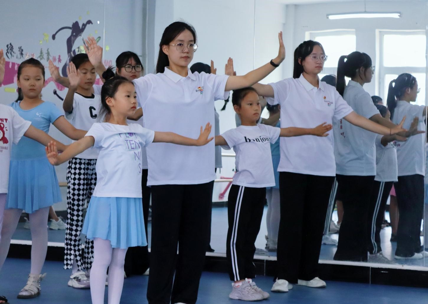 7月26日,实践队与乌兰浩特市少年宫联合开展以“铸牢中华民族共同体意识”主题的系列特色课程,乌兰浩特市义勒力特镇胜利嘎查的儿童和少年宫学员共同参与本次活动。活动中,队员们与小朋友们一起学习书写毛笔字、通过虚拟现实技术沉浸式感受中国传统建筑文化、体验学习与民族舞蹈动作相结合的花样跳绳、开展劳动教育、学习有关民族舞蹈的知识和基础动作并共同完成一场舞蹈表演。通过系列主题课程的开展,让更多的优秀传统文化走进了青少年群体,有助于实践队员和小朋友们在学思践悟中坚定文化自信。