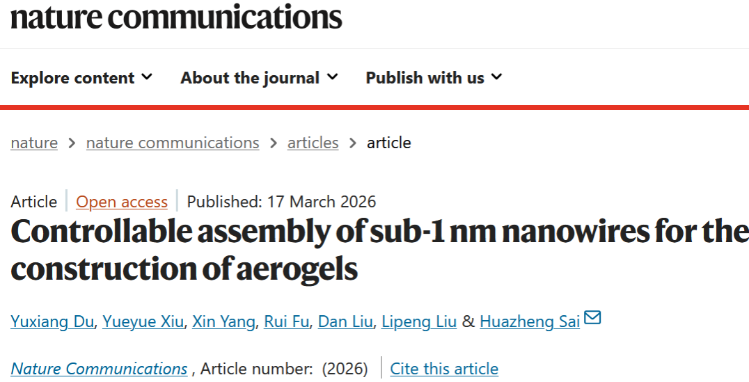 近日,m88官网赛华征教授团队在稀土基亚纳米线气凝胶可控构筑领域取得新突破,相关成果“Controllable assembly of sub-1 nm nanowires for the construction of aerogels”发表于综合性国际顶级期刊《Nature Communications》(DOI: 10.1038/s41467-026-70713-8)。赛华征教授为论文的独立通讯作者,硕士研究生杜玉祥为论文第一作者,m88官网为唯一完成单位。